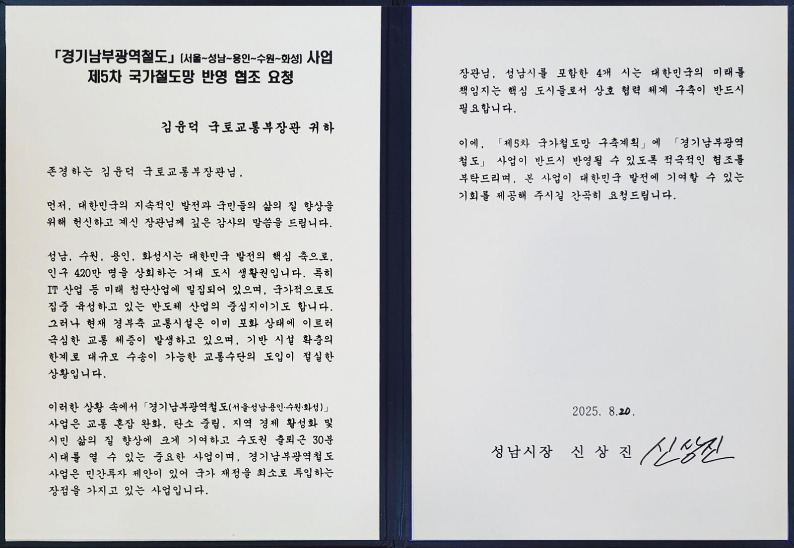 신 시장은 서한에서 “성남·수원·용인·화성은 인구 420만 명이 넘는 거대 생활권으로, IT와 반도체 산업 등 국가 전략산업이 집적된 대한민국 미래 성장의 핵심 도시”라며 “그러나 현재 경부축 교통시설은 포화 상태에 이르러 극심한 정체를 빚고 있으며, 기반 시설 확충에도 한계가 있는 만큼 대규모 수송이 가능한 교통수단의 도입이 절실하다”라고 주장했다.