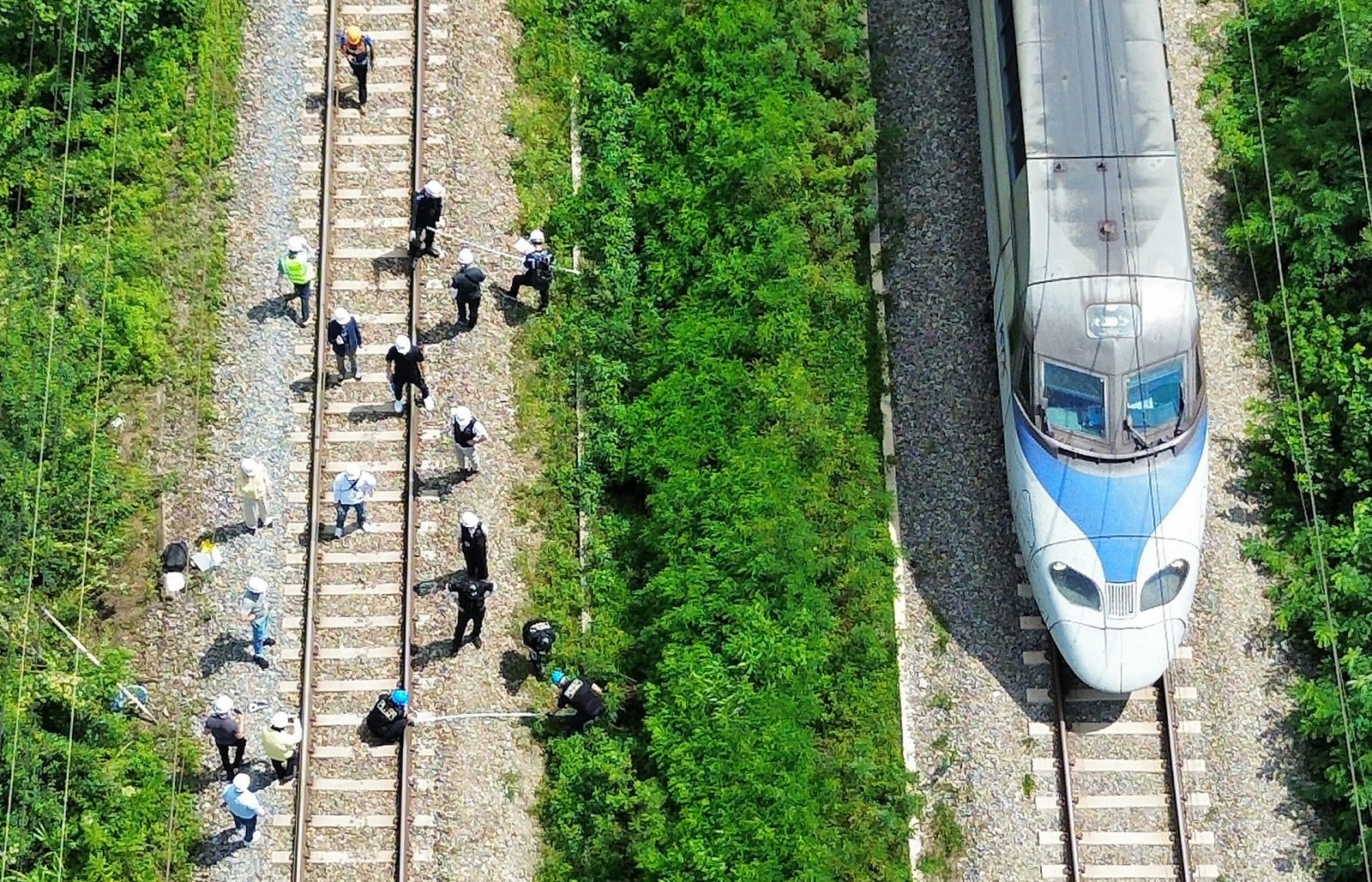20일 오후 경북경찰청, 국립과학수사연구원, 항공철도사고조사위원회, 노동 당국 등 합동감식에 참여한 기관 관계자들이 경북 청도군 화양읍 삼신리 경부선 무궁화호 열차 사고 현장에서 합동감식을 진행하고 있다. 2025.8.20/뉴스1