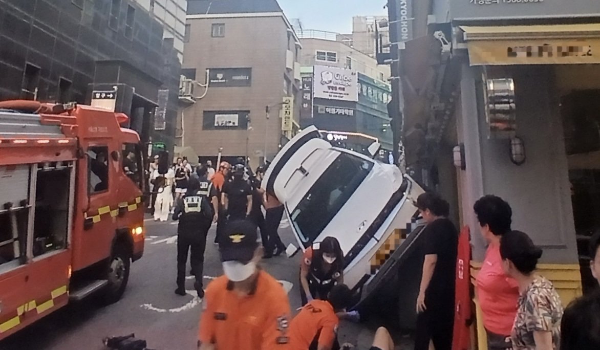21일 경찰과 소방에 따르면 이날 오후 6시 47분경 마포구 서교동의 이면도로에서 택시가 돌진했다는 신고가 접수됐다. 사고를 낸 택시는 보행자를 친 뒤 그대로 인근 상점 벽을 타고 올라가 비스듬한 상태로 멈췄다. 이 사고로 60대 기사와 40대 보행자 2명이 경상을 입고 병원으로 옮겨졌다.