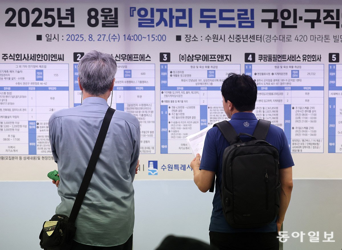 27일 오후 경기 수원시 팔달구 신중년센터에서 열린 ‘일자리 두드림 구인구직의 날’ 행사에서 구직자들이 게시된 채용 공고문을 살펴보고 있다. 수원일자리센터가 주최한 이날 행사에는 5개 업체가 참여했다. 18명을 채용할 예정이며, 총 56명이 지원해 성황을 이뤘다.