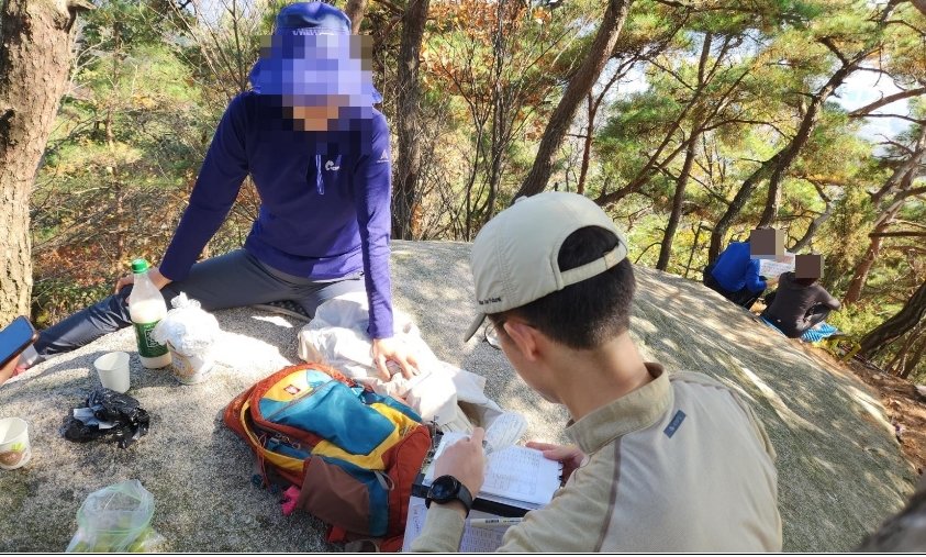 북한산국립공원 특별사법경찰이 자연공원법 금지행위(고지대 음주행위)를 위반한 탐방객을 단속하고 있다. 국립공원공단 제공