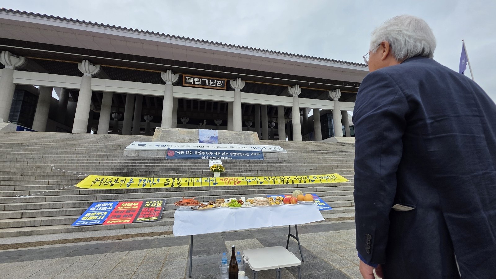 김형석 독립기념관장의 파면과 정상화를 촉구하며 48일째 점거 농성을 이어가고 있는 역사독립국민행동은 6일 기념관 겨레의집 앞 광장에서 차례를 지냈다.