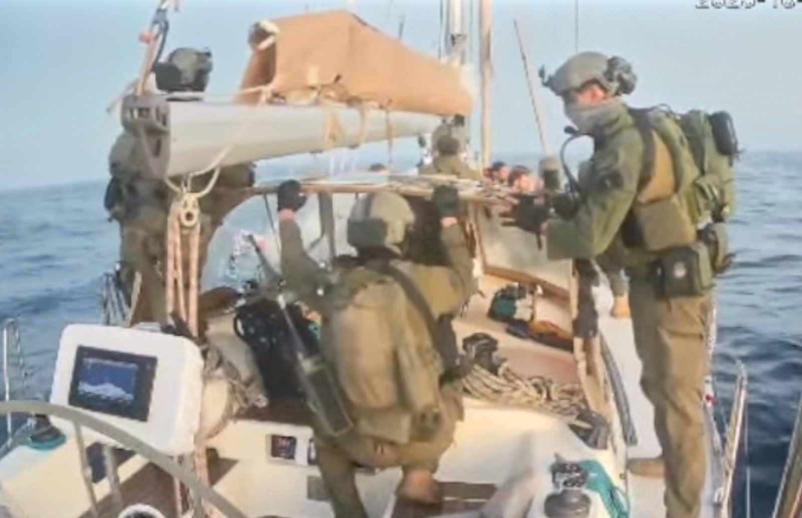 국제 구호선단 ‘글로벌 수무드 플로틸라’(GSF)가 2일(현지 시간) 공개한 영상 사진에 이스라엘 해군 병사들이 가자지구 해안으로 접근하던 GSF 선박에 승선하고 있다. 가자지구 구호를 위한 GSF는 약 50척의 민간 선박과 40개국 500여 명의 자원봉사자로 구성되어 있다. 2025.10.02 가자지구=AP 뉴시스