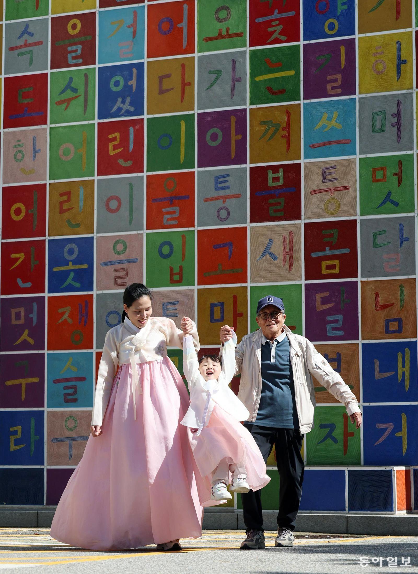 한글날을 하루 앞둔 8일 경기 용인시 기흥구 경기도어린이박물관을 찾은 가족이 알록달록한 모자이크 타일로 만들어진 한글 벽화 앞에서 즐거운 시간을 보내고 있다.