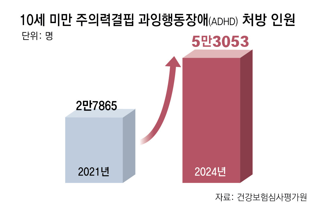 건강보험심사평가원에 따르면 10세 이하 ADHD 급여 의약품 처방 인원은 2021년 2만7865명에서 지난해 5만3053명으로 3년 새 1.9배로 늘었다. 의료계에선 ADHD 증상에 관심을 갖는 부모가 늘면서 과거 ‘산만한 아이’ 정도로 여겼던 ADHD 환자가 조기 발견되는 것도 영향을 미친 것으로 분석한다.
