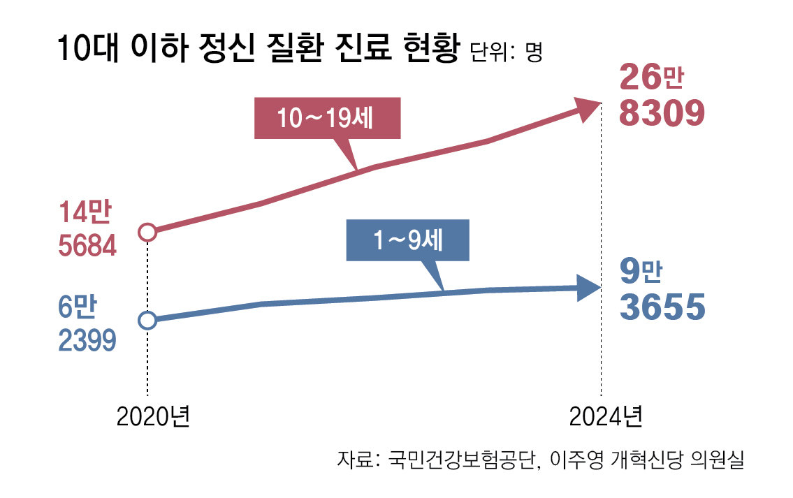 8일 국회 보건복지위원회 소속 개혁신당 이주영 의원이 국민건강보험공단에서 받은 자료에 따르면 지난해 정신 질환으로 병원 진료를 받은 1∼9세 아동은 9만3655명으로 집계됐다. 2020년 6만2399명에서 4년 만에 50.1% 늘었다. ADHD 등 운동 과다장애, 우울장애, 불안장애, 적응장애 등 소아 정신건강 질환 진료 인원을 모두 포함한 수치다.