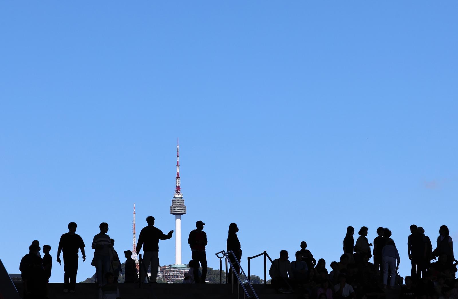 추석연휴 엿새째인 8일 서울 용산구 국립중앙박물관을 찾은 시민들이 맑게 갠 하늘을 바라보고 있다. 2025.10.8/뉴스1