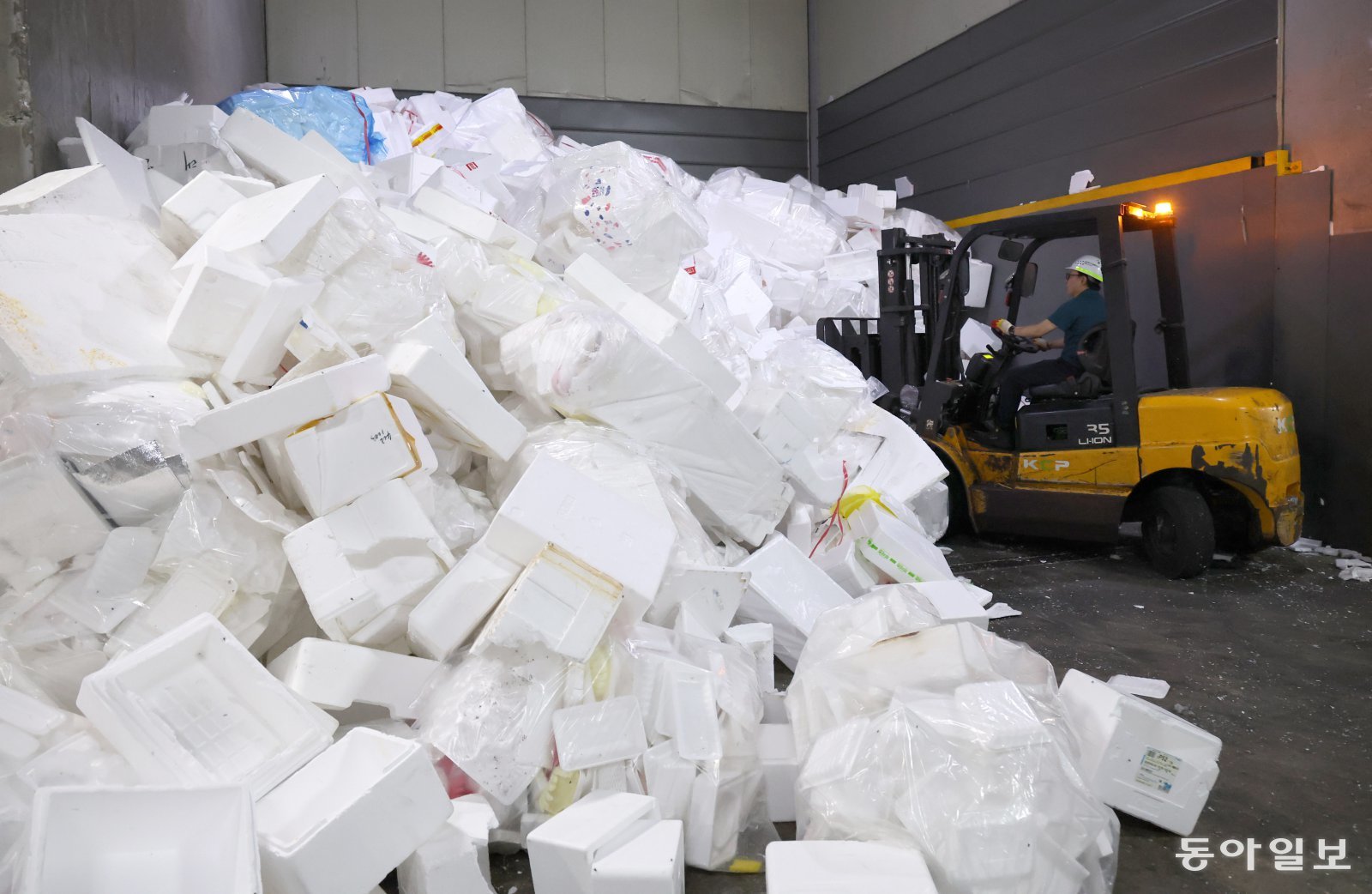 9일 오후 경기 하남시환경기초시설 재활용선별장에서 만난 한 직원은 산처럼 쌓인 스티로폼 더미를 가리키며 이렇게 말했다. 추석 선물 포장에 쓰인 스티로폼 상자가 4∼5m 높이로 쌓여 있었다. 그는 “추석 땐 일주일 내내 새벽 2시까지 교대 근무를 했다”며 “올해는 인력이 부족해 일용직까지 불러야 했다”고 덧붙였다.