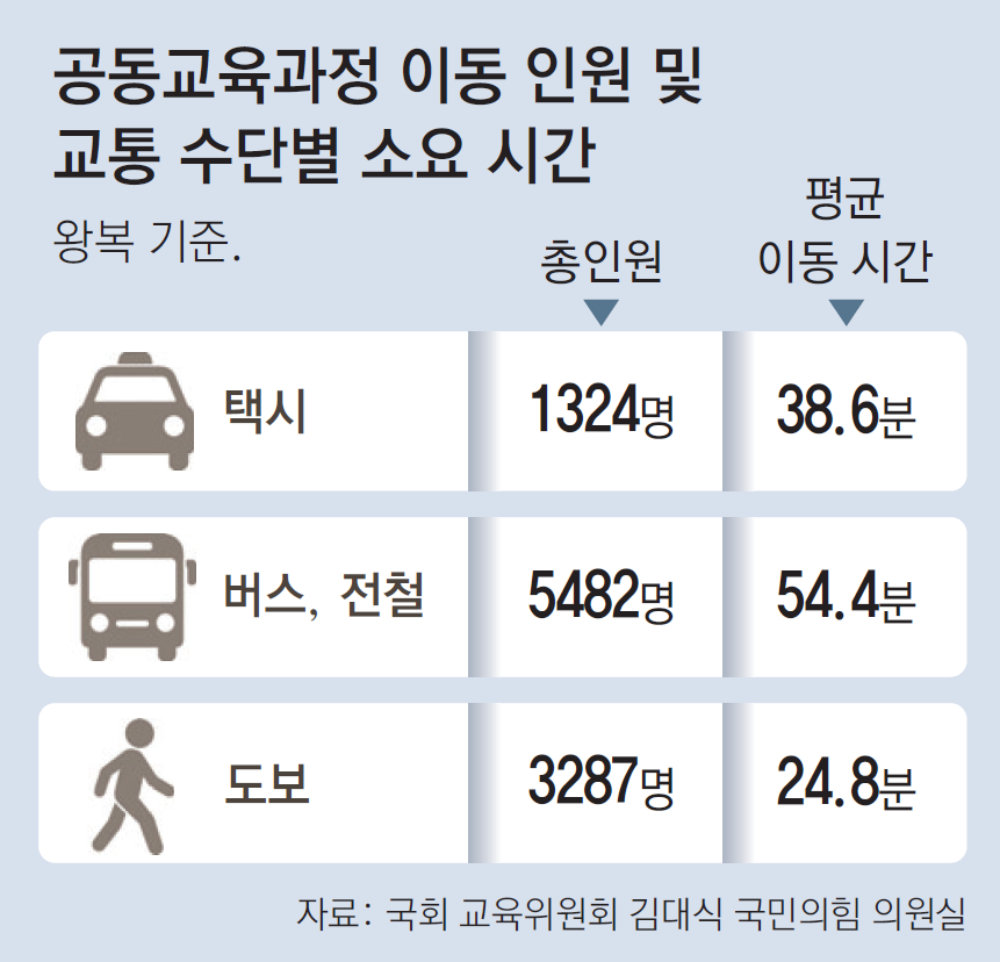 공동교육 과정 수강 학생 중 택시를 이용해 공동교육 과정 수업을 들은 학생은 1324명이었고 평균 이동 시간은 38.6분이었다. 버스와 지하철 등 대중교통 이용은 5482명 54.4분, 도보 이동은 3287명 24.8분이었다. 지방의 경우 학교 수가 적어 학교 간 이동 거리가 길고, 개설 수업 자체를 찾지 못하는 경우도 많다.