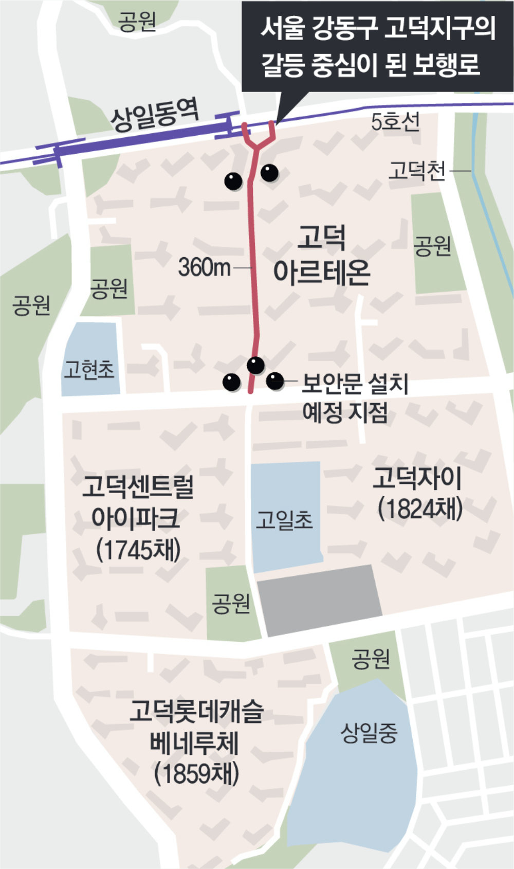 갈등은 이달 초 고덕아르테온 입주자대표회의가 보행로에 보안시설을 설치하기로 하면서 불거졌다. 외부인 출입을 막자는 안건에 입주민 3분의 2 이상이 찬성한 것. 대표회의 측은 “올 1월 인근 주민이 단지 내에서 넘어져 우리 측에 보험금을 청구한 사례가 있었고, 7월엔 외부 청소년이 지하 주차장에 침입해 차량에 소화기를 분사하는 등 안전사고가 잇따랐다”고 주장했다. 대표회의는 13일 강동구에 보안시설 설치 허가를 요청할 계획이다. 강동구가 이를 거부하면 행정소송을 제기하겠다는 방침이다.