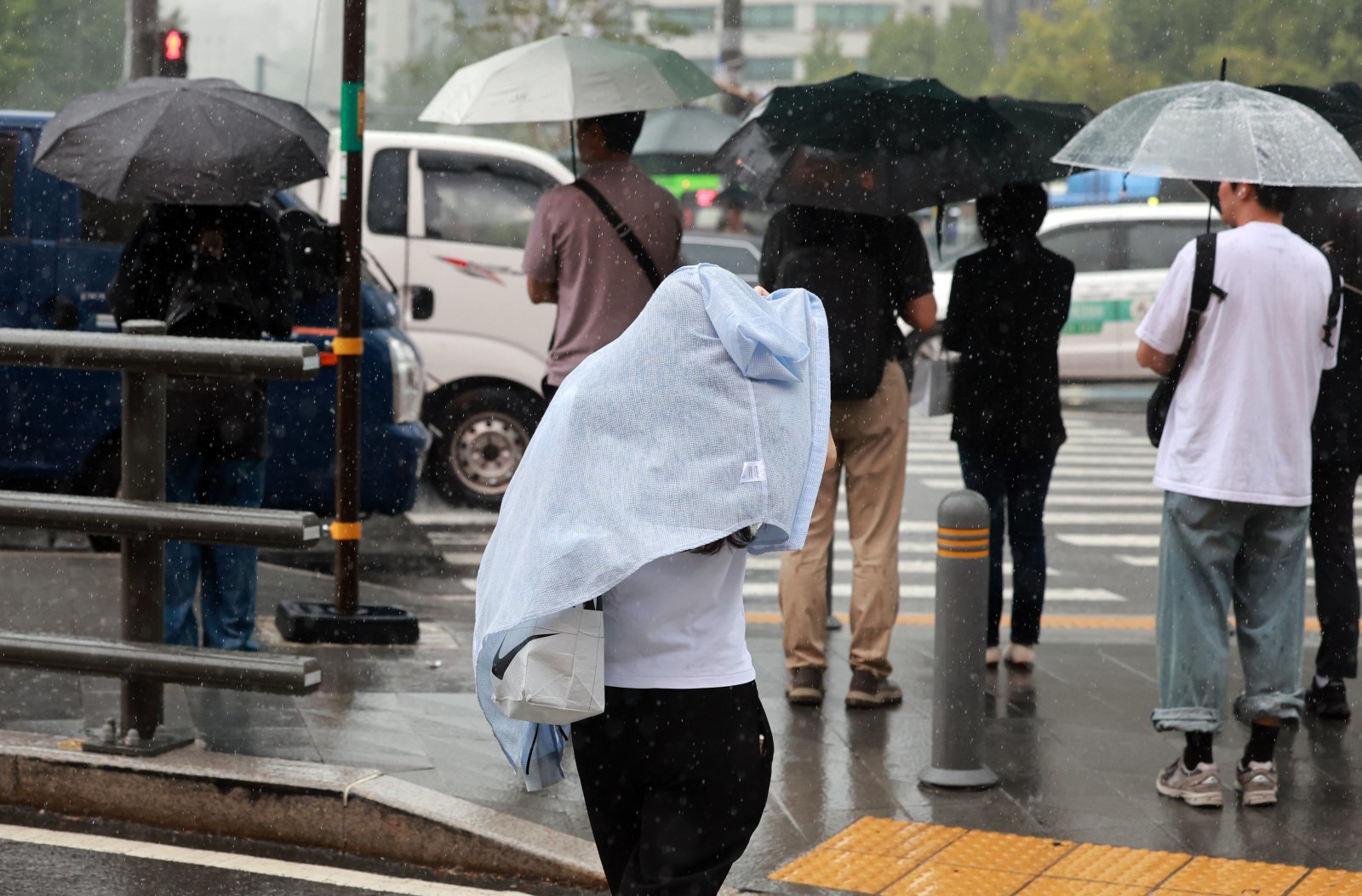 비가 내린 24일 오후 서울 종로구 광화문 네거리에서 한 시민이 옷으로 몸을 감싸며 걸어가고 있다. 2025.09.24 뉴시스