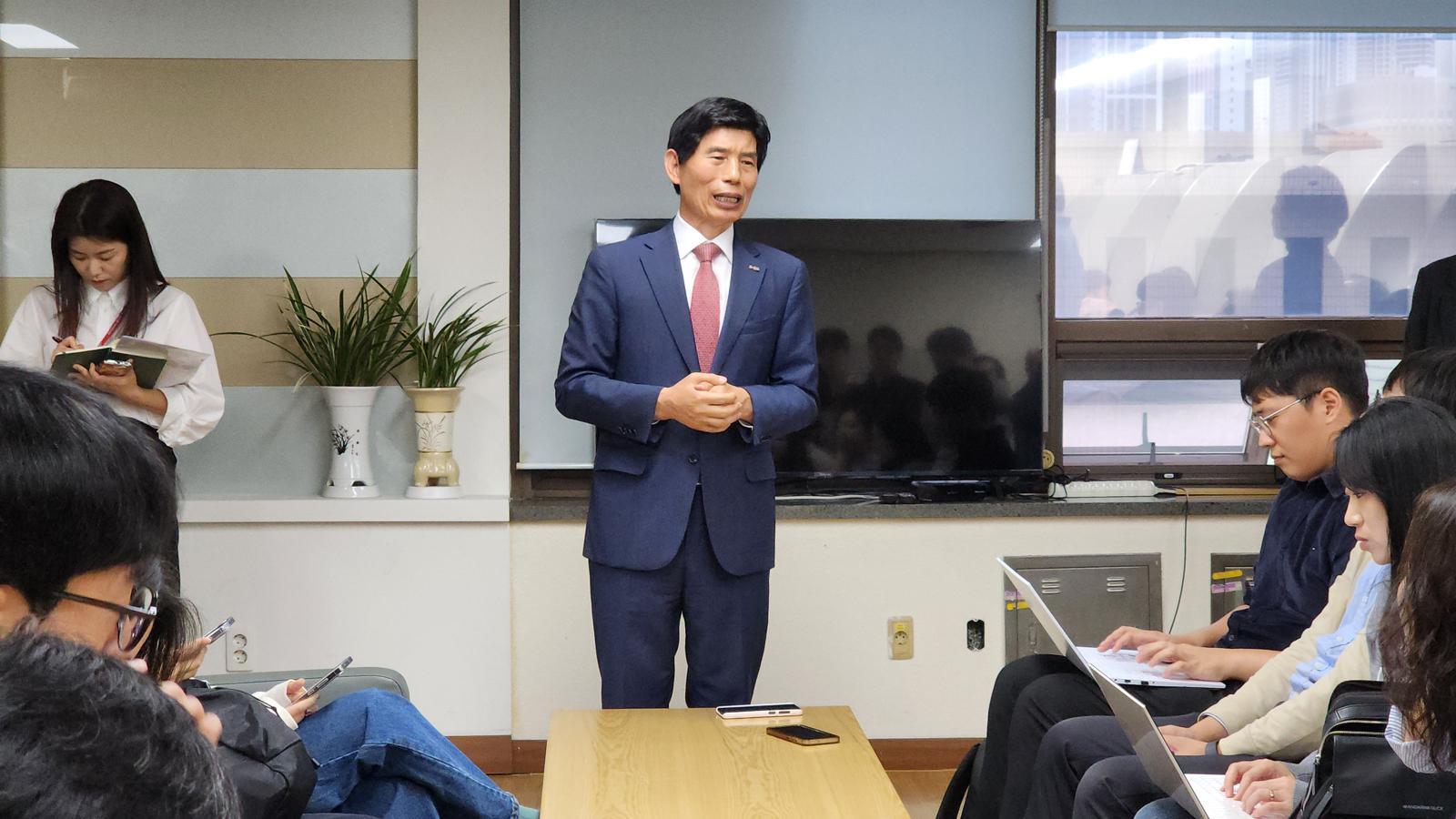 이태훈 대구 달서구청장이 13일 중구 시청 동인청사 기자실에서 신청사 건립 사업의 대변화를 주장하고 있다. 달서구 제공