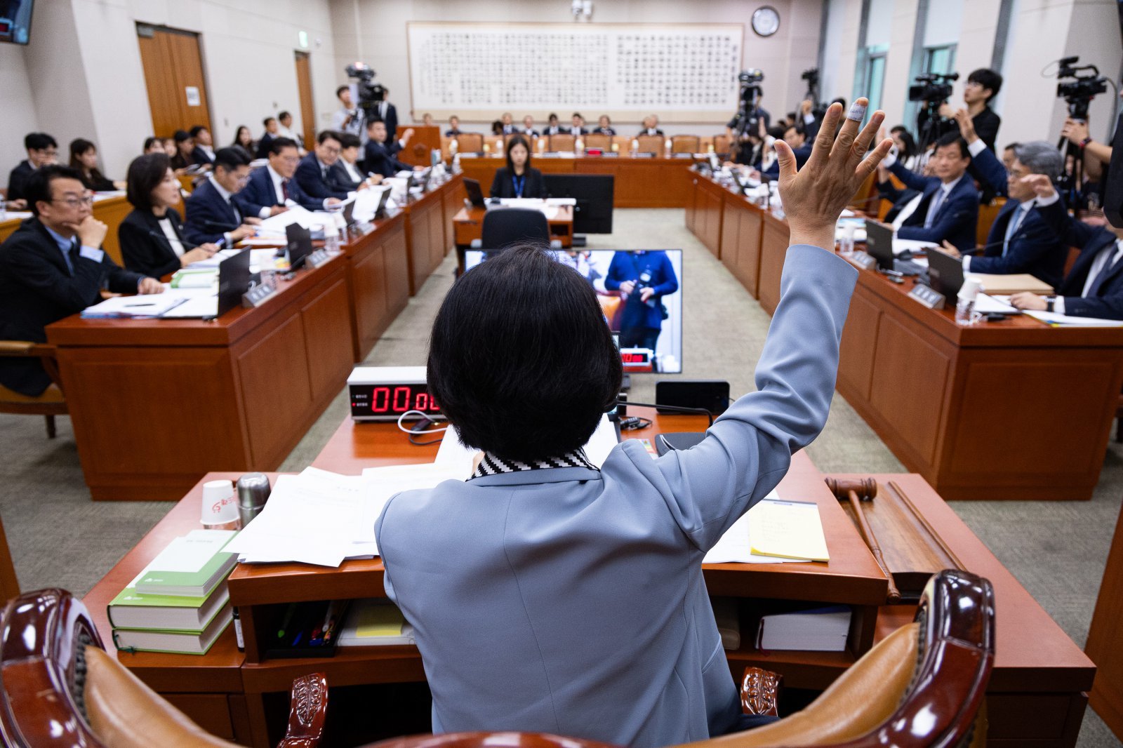 추미애 국회 법제사법위원장을 비롯한 더불어민주당 의원들이 13일 서울 여의도 국회에서 열린 제429회 국회(정기회) 법제사법위원회 제8차 전체회의에서 거수 표결을 하고 있다. 나경원 국민의힘 의원 등이 제출한 ‘민중기 특검팀 강압수사에 의한 양평군 공무원 사건 진상규명을 위한 민중기 특검팀에 대한 현장검증 실시계획서 채택의 건’은 이날 법사위 전체회의에서 거수 표결한 결과 재석 17명 중 반대 10명으로 부결됐다. 2025.10.13/뉴스1