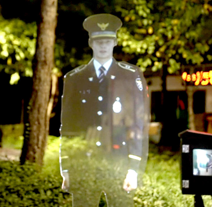 서울 중부경찰서는 지난해 10월부터 ‘중부 안전한 공원 만들기’ 사업의 일환으로 홀로그램 경찰 안내 시스템을 운영하고 있다고 13일 밝혔다. 홀로그램 경찰은 해가 진 뒤인 오후 7∼10시에 2분 간격으로 나타나 “이 지역은 지능형 폐쇄회로(CC)TV가 설치돼 있다. 폭력 등 긴급 상황 발생 시 경찰이 실시간으로 대응할 수 있다”는 음성을 반복한다. 실제 사람과 비슷한 약 175cm 크기로 송출돼 멀리서 보면 실제 경찰관이 서 있는 듯 보인다. 홀로그램은 빛의 간섭 현상을 이용해 실제 물체처럼 보이게 하는 기술이다.