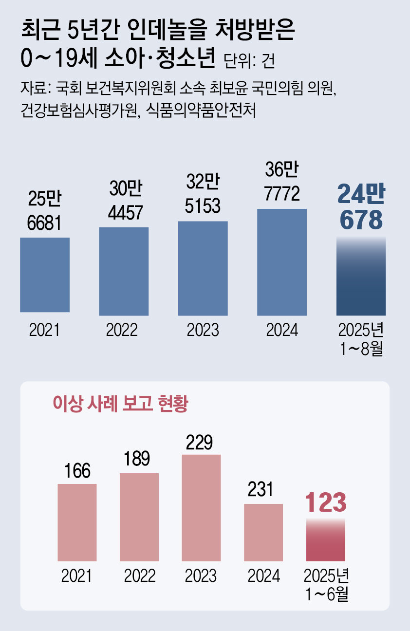 13일 국회 보건복지위원회 소속 최보윤 국민의힘 의원이 건강보험심사평가원 등으로부터 받은 자료에 따르면, 최근 5년간 0∼19세 소아·청소년에게 처방된 인데놀은 총 170만2422건이다. 2020년 20만7681건에서 지난해 36만7772건으로 약 1.4배로 늘었다. 올해는 1∼8월에만 24만678건이 처방됐다.