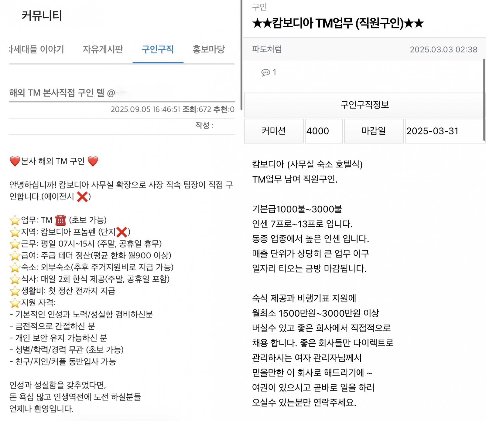 유럽 한인 커뮤니티에는 ‘본사 해외 TM 구인’ 글이 올라왔다. 캄보디아 프놈펜에서 한 주에 한화로 900만원 이상을 벌 수 있으며 숙식이 제공된다고 적혀 있었다. 지원 자격은 ‘금전적으로 간절하신 분’ ‘개인 보안 유지 가능하신 분’ 등이었다.