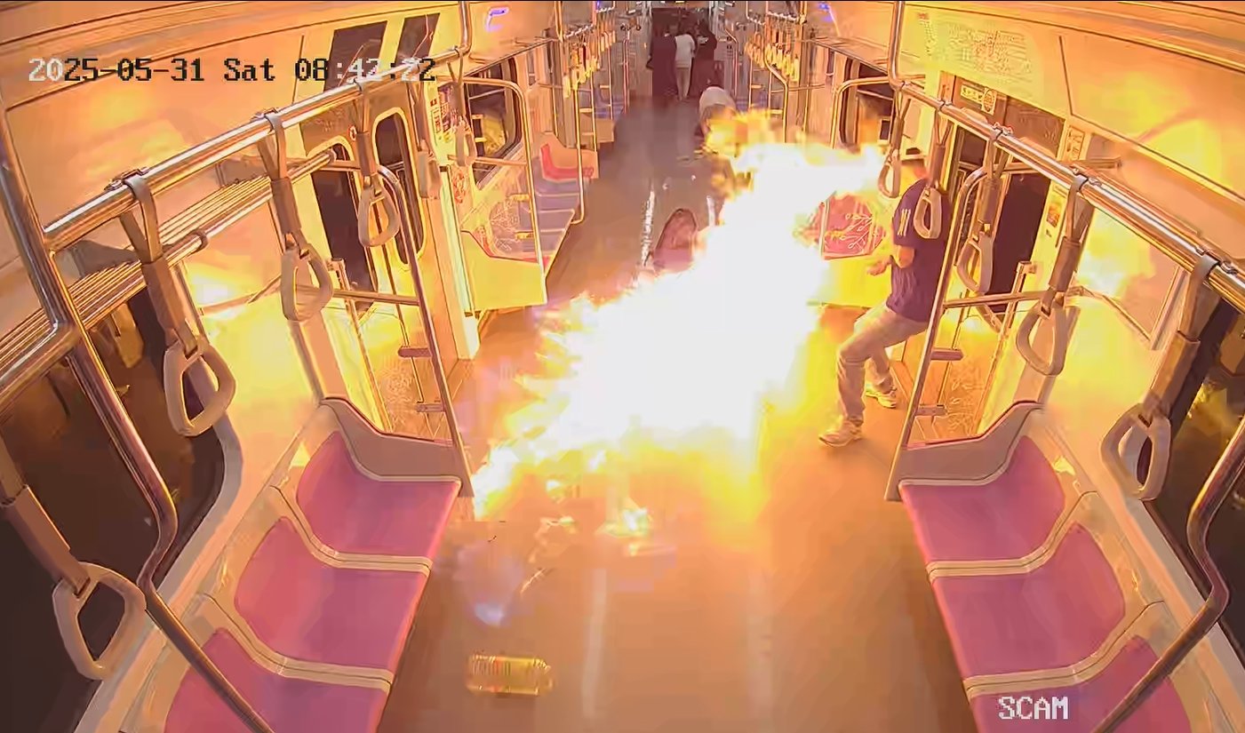 5월 31일 오전 8시 42분쯤 60대 남성 원 모 씨가 지하철 5호선 여의나루역과 마포역 간 터널 구간을 달리는 열차에 불을 지르고 있다. 서울남부지검 제공