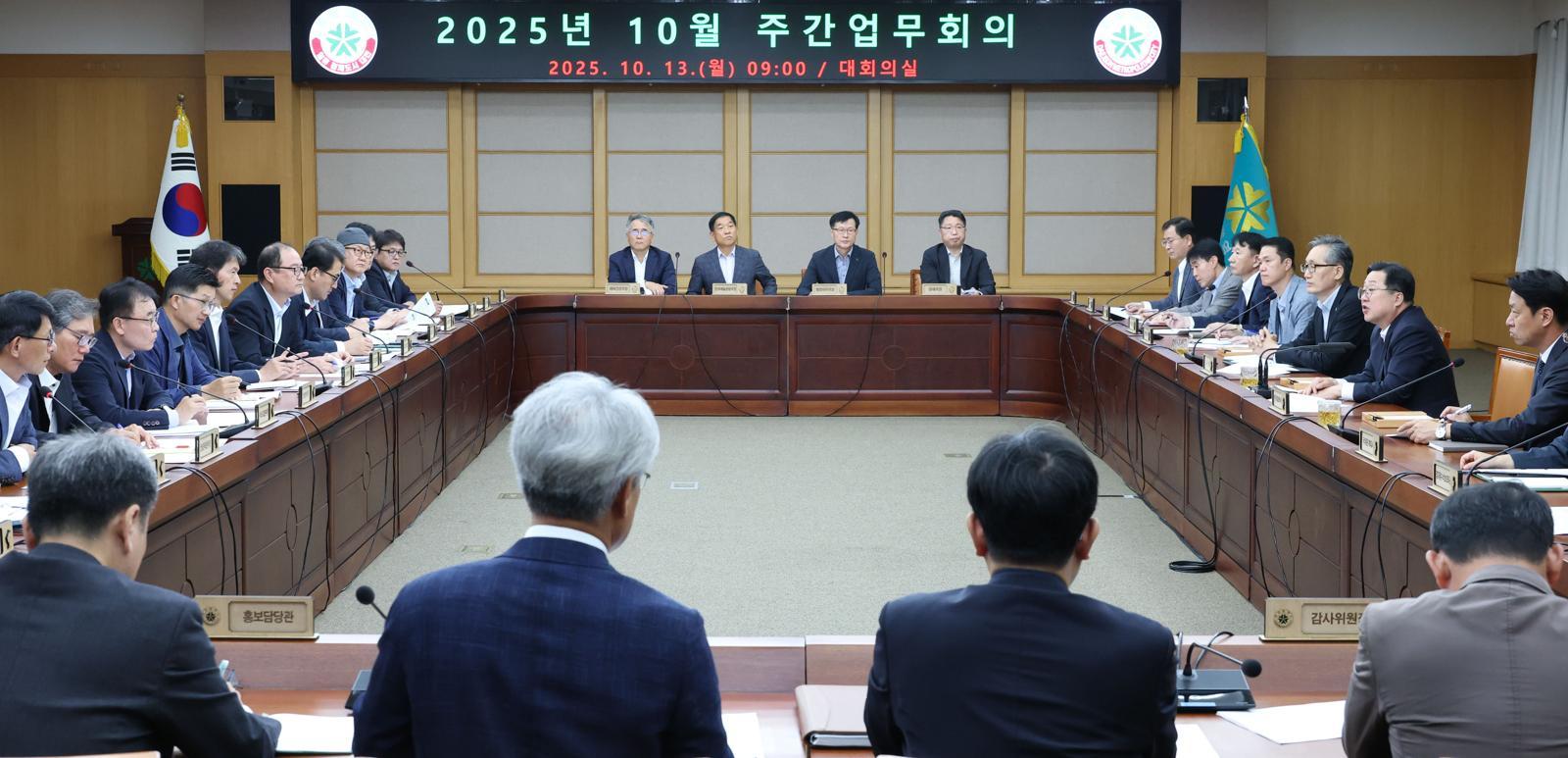 이장우 대전시장이 13일 대전시청 대회의실에서 열린 주간업무회의에서 결혼장려금 전액 지급과 도시철도 2호선 공사 등 주요 현안 추진 상황을 점검하고 있다. 대전시 제공