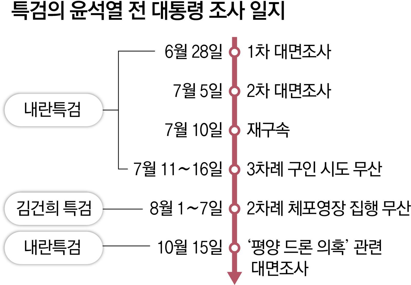 윤 전 대통령은 15일 오전 7시 30분경 서울구치소 독거실을 찾은 김도형 서울구치소장으로부터 “특검이 체포영장을 집행할 것”이라고 전해 들었다. 앞서 내란 특검(특별검사 조은석)은 지난달 24일과 30일 “평양 드론 의혹 관련 외환 및 직권남용 혐의에 대해 조사를 받으라”며 출석을 요구했는데, 윤 전 대통령이 응하지 않자 체포영장을 발부받은 것이다.