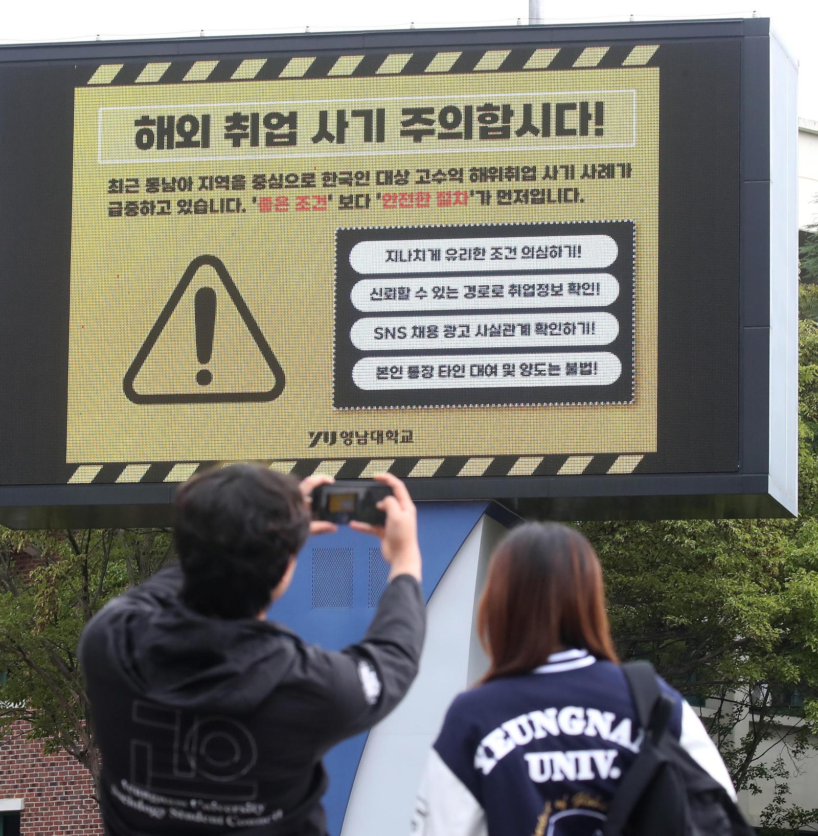 캄보디아에서 한국인을 노린 해외 취업 사기와 납치 사건이 잇따르자 대학가에도 비상이 걸렸다. 16일 경북 경산시 영남대 캠퍼스 전광판에 학생들에게 해외 취업 사기에 주의하라는 안내문이 게시되고 있다.