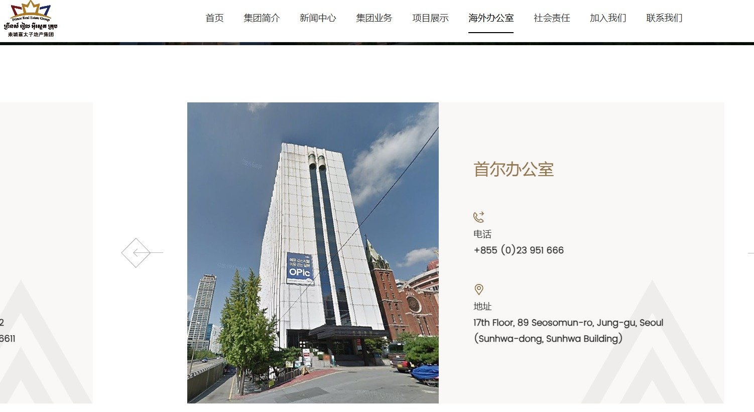 17일 국회 행정안전위원회 소속 서범수 국민의힘 의원실에 따르면 프린스그룹의 부동산 계열사 ‘프린스 리얼이스테이트 그룹’은 홈페이지를 통해 서울 중구 순화동에 ‘한국사무소’가 있다고 안내하고 있다. 다만 기재된 연락처는 캄보디아 국가번호다.