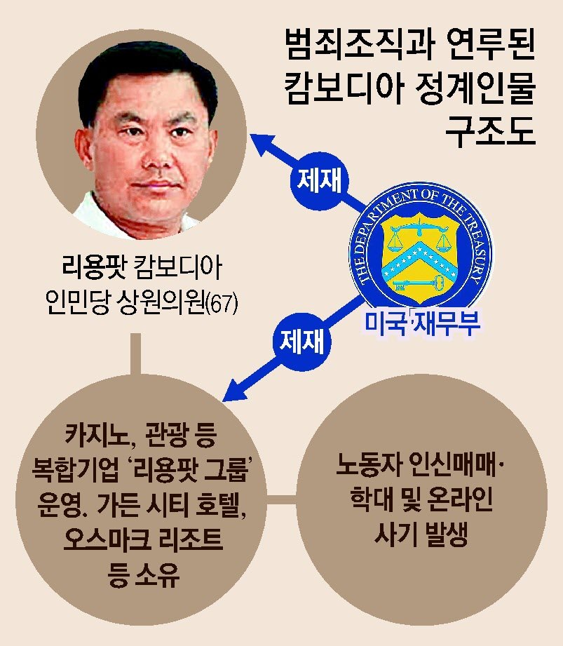 캄보디아 내에서 잇따르는 한국인 납치·감금 사건의 배경으로 현지 범죄조직과 집권당 권력층의 유착이 지목된다. 올 2월 리 의원이 소유한 북서부 국경지대 오스마크 리조트에선 외국인 약 60명이 집단 탈출하는 일이 벌어졌다. 미국 재무부는 “이들은 취업 사기 피해자로, 도착 후 휴대전화와 여권을 압수당하고 사기 행위를 강요당했다”며 “구타와 전기 충격 등 학대를 당하고 몸값 등을 강요받았다”고 밝혔다.