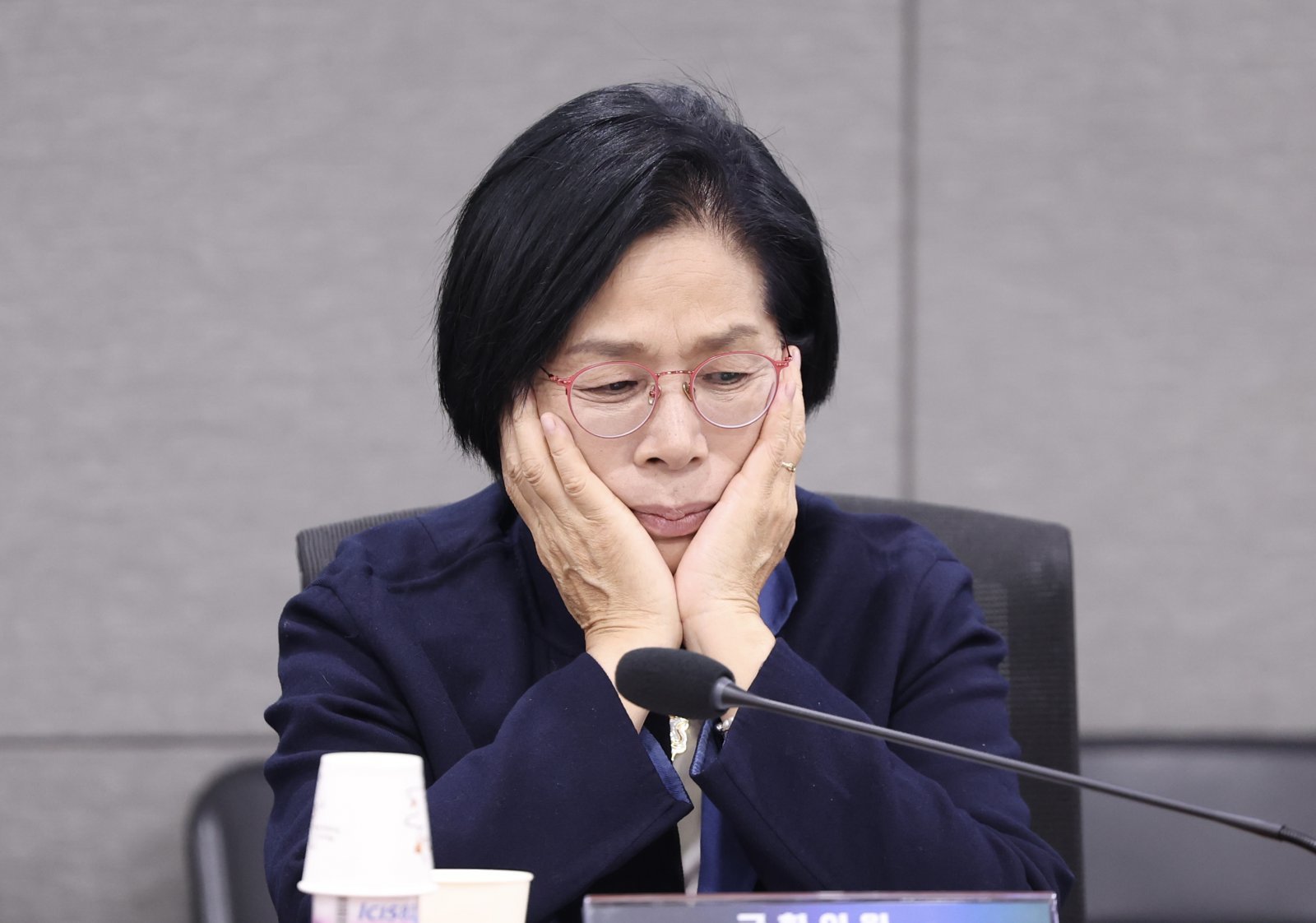 최민희 국회 과학기술정보방송통신위원장이 22일 오후 서울 여의도 국회 의원회관에서 열린 AI의 등장과 미디어 생태계의 변화 토론회에서 얼굴을 만지고 있다. 2025.10.22. 뉴시스