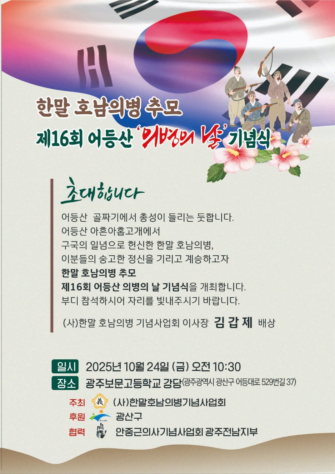 (사)한말호남의병기년사업회는 24일 오전 10시 반 광주 광산구 어등산에 자리한 보문고 강당에서 제16회 한말 호남의병추모제 및 어등산 의병의 날 기념식을 개최한다고 밝혔다.