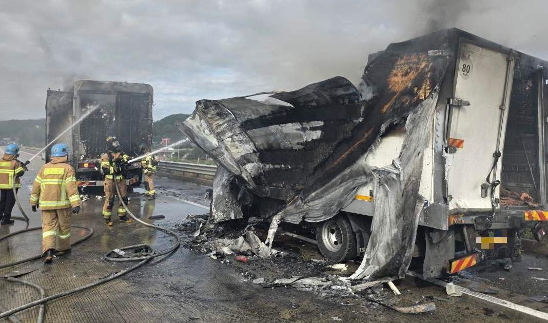 23일 오전 9시 34분경 경기 안성시 평택제천고속도로 평택 방향 남안성 나들목 인근에서 4중 추돌사고가 발생해 소방관들이 25t 트럭에 붙은 불을 끄고 있다. 이 사고로 운전자 1명이 중상을 입어 헬기로 이송됐다.