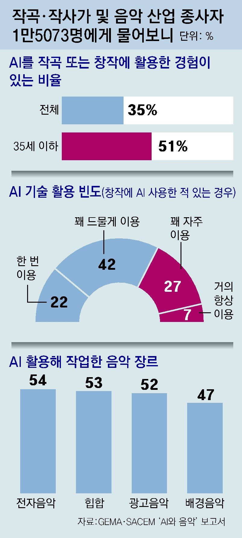 하지만 AI 시대는 이미 돌이킬 수 없는 현실이 된 것도 분명하다. 프랑스와 독일의 저작권 관리 단체 사셈(SACEM)과 게마(GEMA)가 공동 의뢰한 보고서에 따르면, 설문조사에서 창작자 1만5073명 중 35%가 이미 “AI를 음악 창작에 활용한 경험이 있다”고 답했다. 35세 이하 젊은 음악가로 한정하면 이 비율은 51%에 이른다. 장르별로는 전자음악(54%), 힙합(53%), 광고음악(52%), 영상·배경음악(47%) 순이었다.