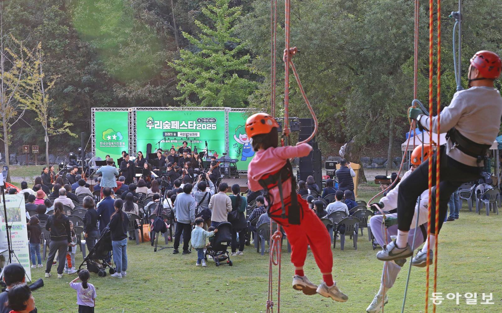 25일 대전 유성구 국립대전숲체원에서 열린 ‘2025 우리숲페스타’ 음악회에서 상수리나무 오르기 체험 참가자들이 줄에 매달린 채 공연을 관람하고 있다. 김태영 기자 live@donga.com