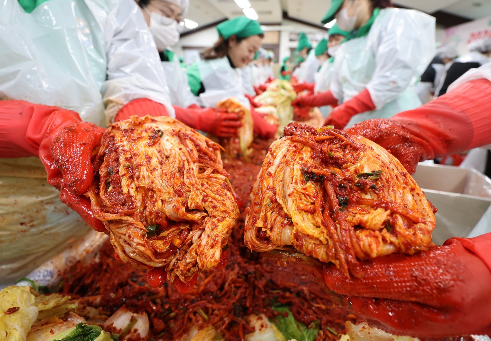 20일 오전 인천 미추홀구 새마을회관에서 열린 2024 사랑의 김장 나누기 행사에서 회원들이 김장을 하고 있다. 이 날 담근 김장 김치 2000포기 500박스는 관내 홀몸 어르신, 한부모가정 등 저소득층에게 전달된다. 2024.11.20. 인천=뉴시스