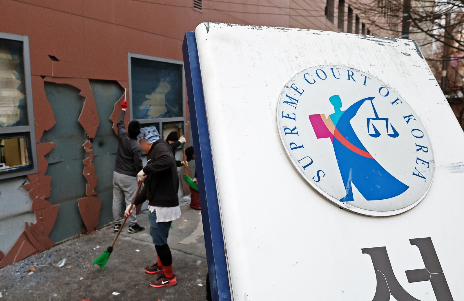 19일 오후 윤석열 대통령 지지자들의 폭력 난입 사태가 발생한 서울 마포구 서울서부지방법원 후문의 기울어진 법원 현판 뒤에서 관계자들이 폐기물을 치우고 있다. 2025.1.19/뉴스1