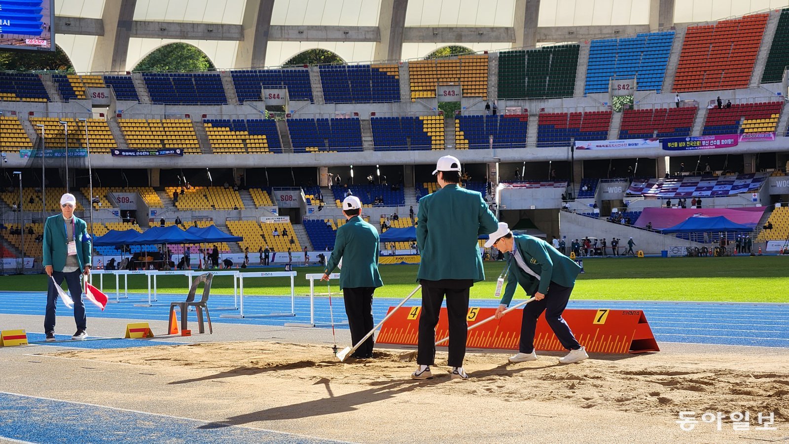 21일 부산 연제구 부산아시아드주경기장 멀리뛰기 경기장에서 육상 심판들이 모래 평탄화 작업을 하고 있다.