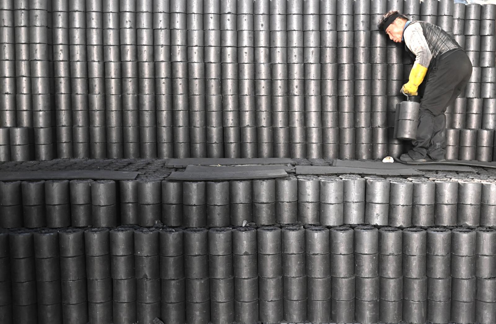 초겨울 추위가 찾아온 27일 경기 화성시 배양동의 한 연탄 출하장에서 직원이 연탄 더미 위에서 연탄을 옮기고 있다. 밥상공동체 연탄은행에 따르면 전국 약 5만9700가구가 여전히 연탄을 주요 난방 수단으로 사용하고 있으며, 올해 연탄 가격은 장당 900원으로 2022년(850원)보다 5.8% 올랐다.