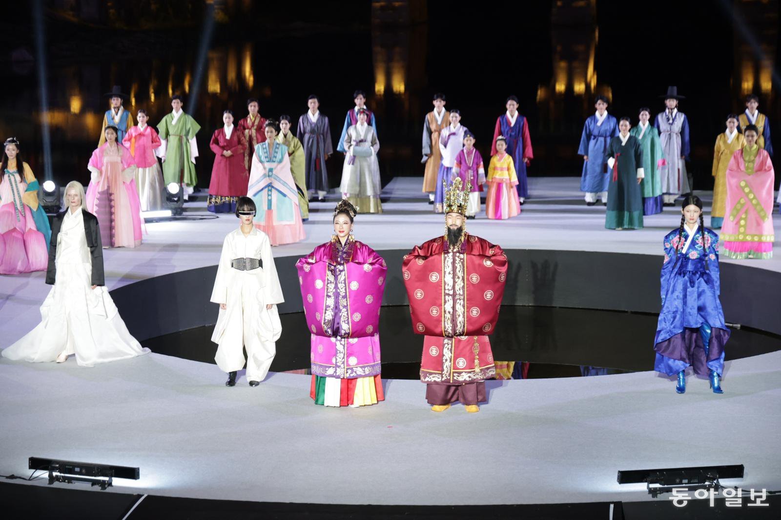 한복 패션쇼는 3막으로 구성됐다. 1막 ‘과거-한복, 천년 금빛으로 깨어나다’에서는 신라고취대의 연주와 함께 왕과 왕비의 대례복, 귀족 복식 등 30벌의 신라풍 한복이 선보였다. 신라 금관과 불국사 단청, 첨성대 문양 등에서 영감을 받은 황금빛 의상들이 고도의 품격을 재현했다.
