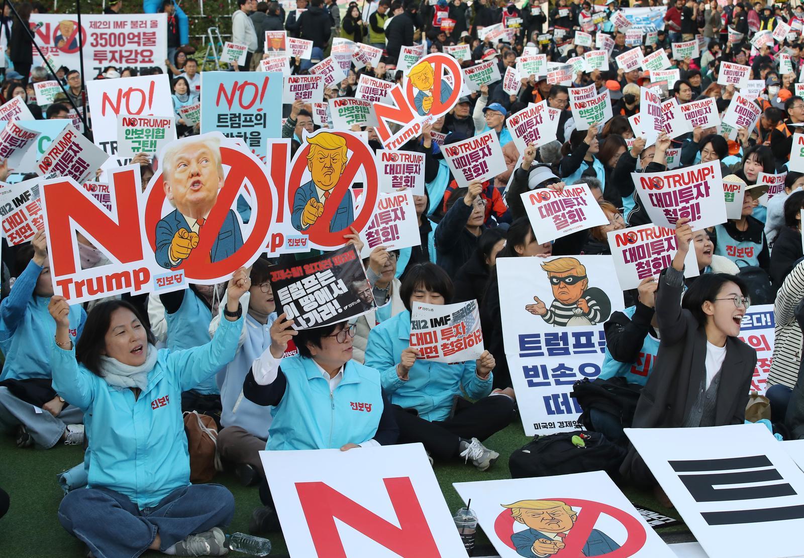 29일 오후 경북 경주시 성동동 구 경주역 광장에서 민주노총 주최로 열린 ‘트럼프 방한 반대 결의대회’에서 참석자들이 트럼프 반대 구호를 외치고 있다. 2025.10.29 뉴스1