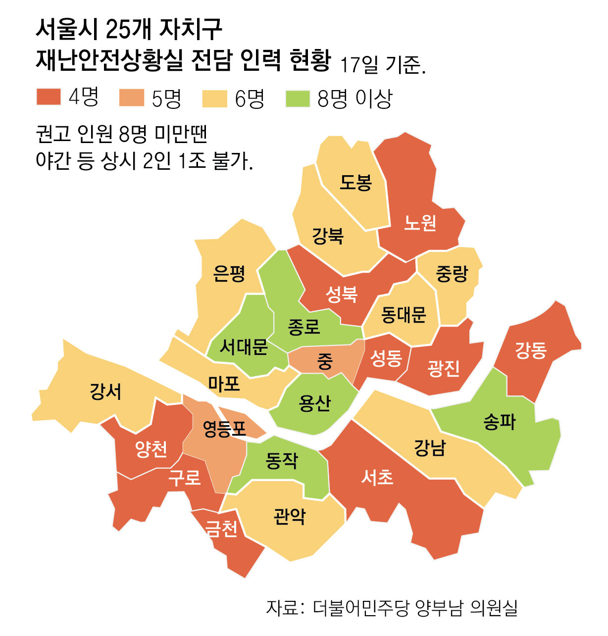 29일 더불어민주당 양부남 의원이 서울시로부터 제출받은 자료에 따르면 17일 기준 서울시 25개 자치구 중 20곳(80%)의 재난안전상황실 운영 인력이 권고 기준 미달인 것으로 조사됐다. 행정안전부와 서울시의 권고 기준은 8명 이상이다. 주간·야간(오후 9시∼오전 9시) 풀타임 근무와 통신대기, 휴무 등 ‘2인 1조-4교대 체계’를 유지해 재난 시 대응 능력을 높이기 위해서다.