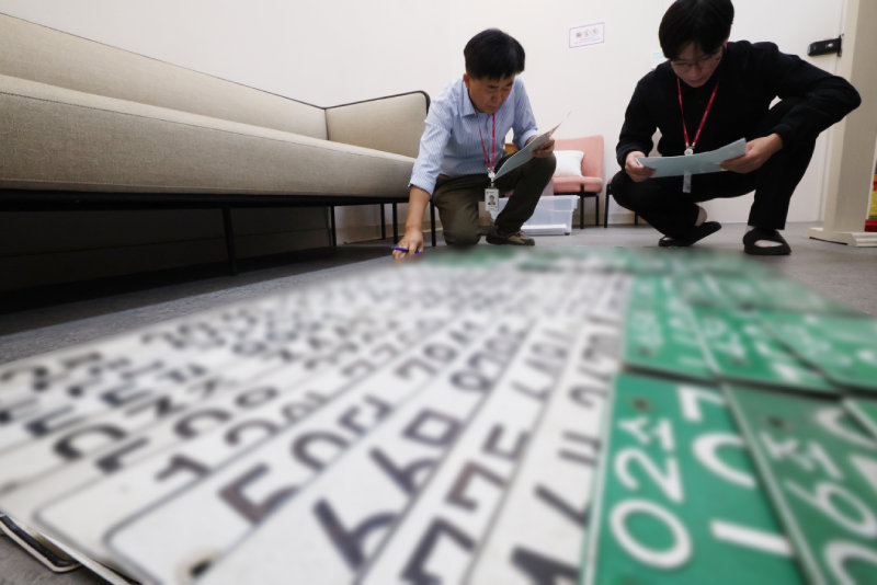 경기도가 연말까지 현장 징수·세원 발굴 TF팀 30명을 투입해 고액 체납자에 대한 집중 징수에 나선다. 사진은 28일 경기 의왕시 고천동 의왕시청 징수과 사무실에서 직원들이 체납 차량에서 압수해 보관 중인 번호판을 확인하고 있는 모습. 뉴스1