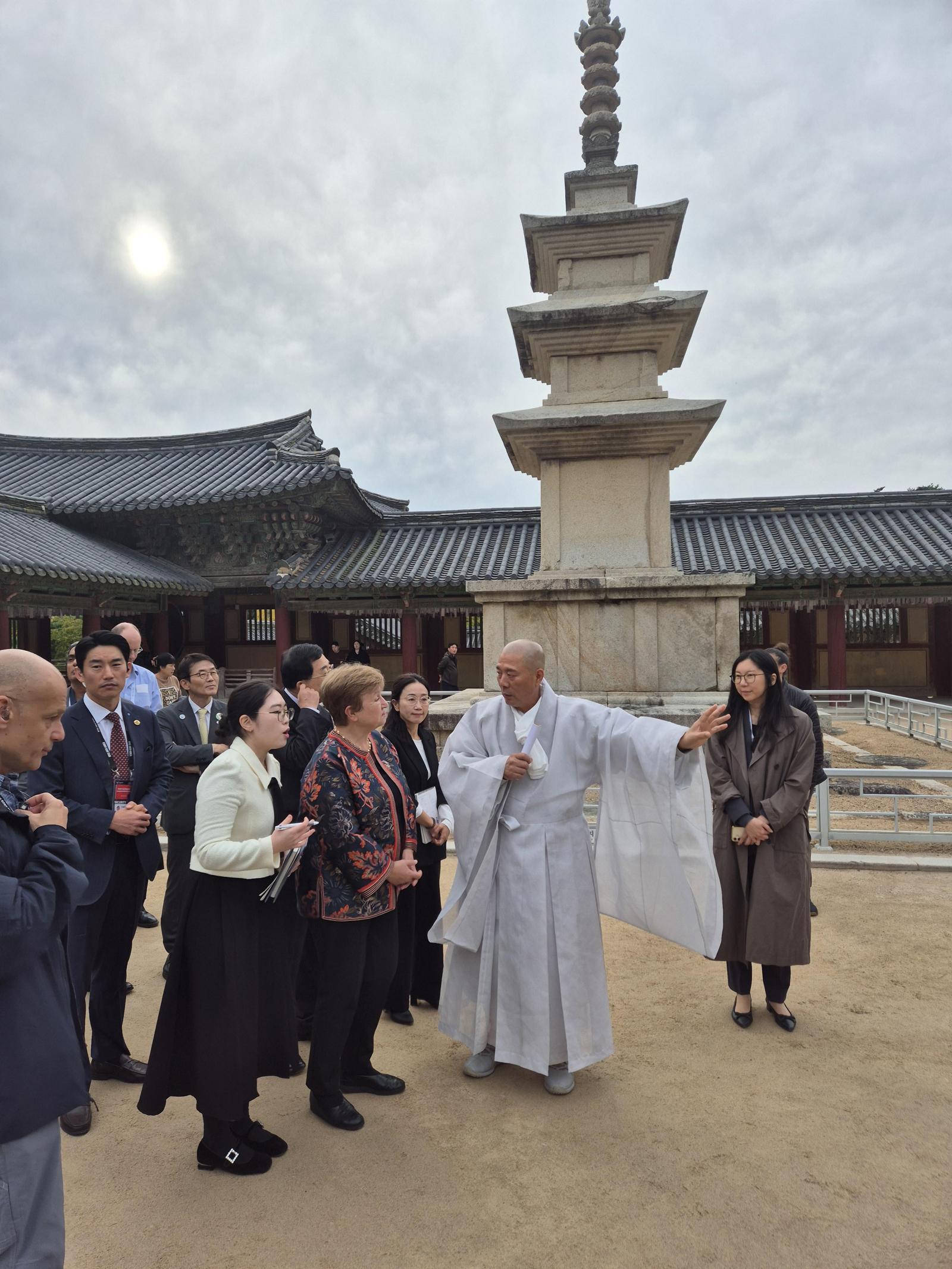 30일 경주 불국사를 찾은 크리스탈리나 게오르기에바 국제통화기금(IMF) 총재가 안내 스님의 역사적 배경 설명을 듣고 있다. 경북도 제공