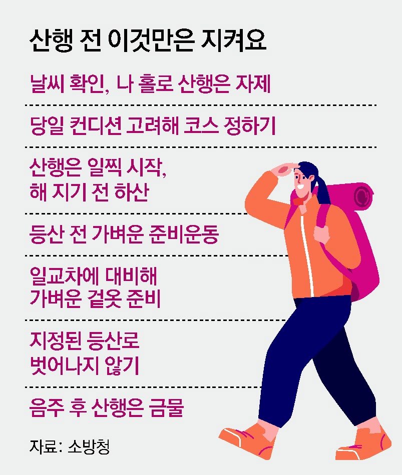 “먼저 기상정보와 일몰 시각을 반드시 확인해야 한다. 해가 빨리 지는 가을에는 혹시 모를 상황을 대비해 휴대전화와 보조배터리, 휴대용 랜턴을 챙기는 것이 좋다. 체력 저하를 막기 위해 충분한 물과 간식을 준비하고, 홀로 등반하는 ‘나 홀로 산행’은 피해야 한다.”