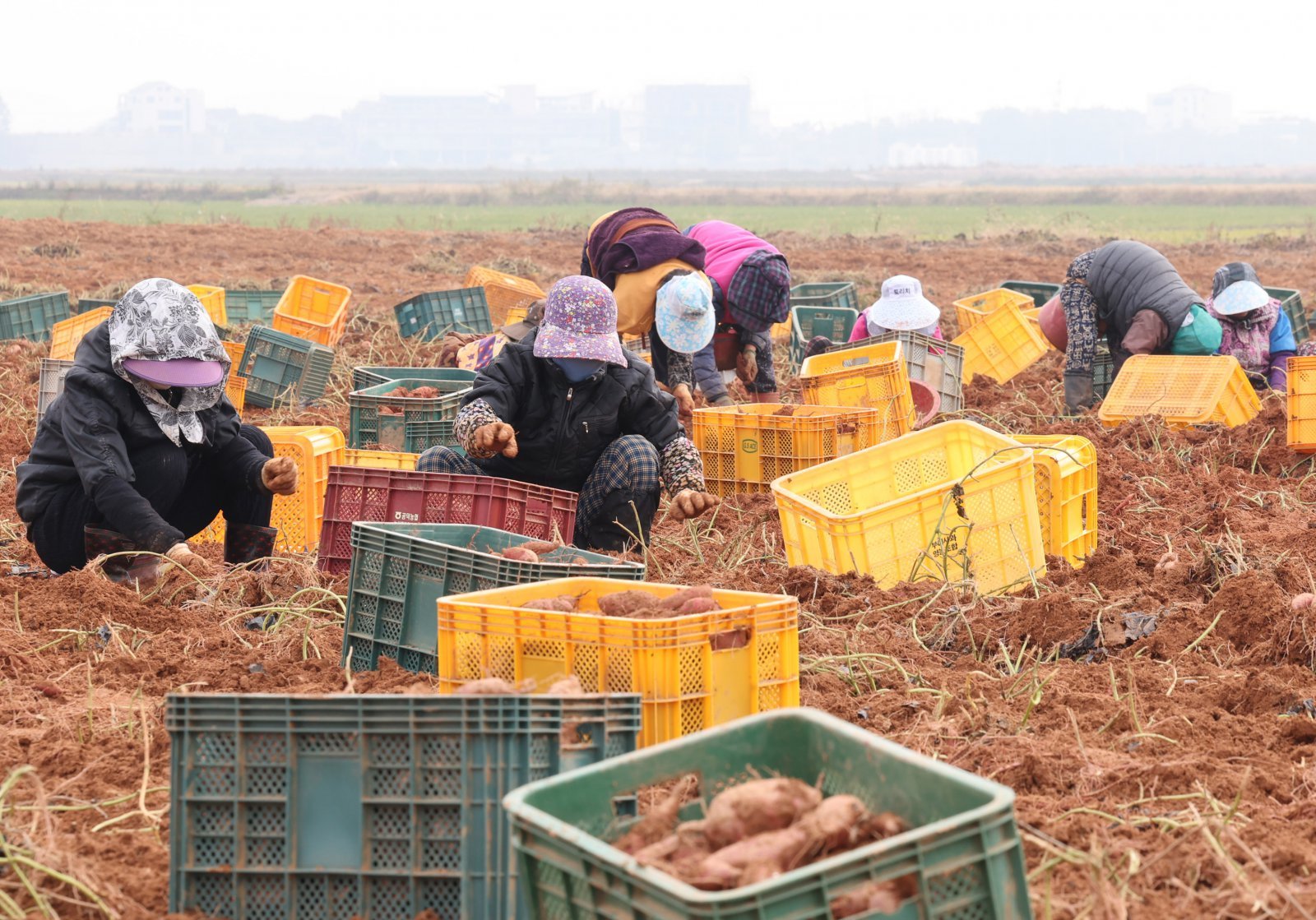 31일 오전 인천 강화군의 한 고구마밭에서 농민들이 강화 고무마를 수확하고 있다. 2025.10.31. 인천=뉴시스