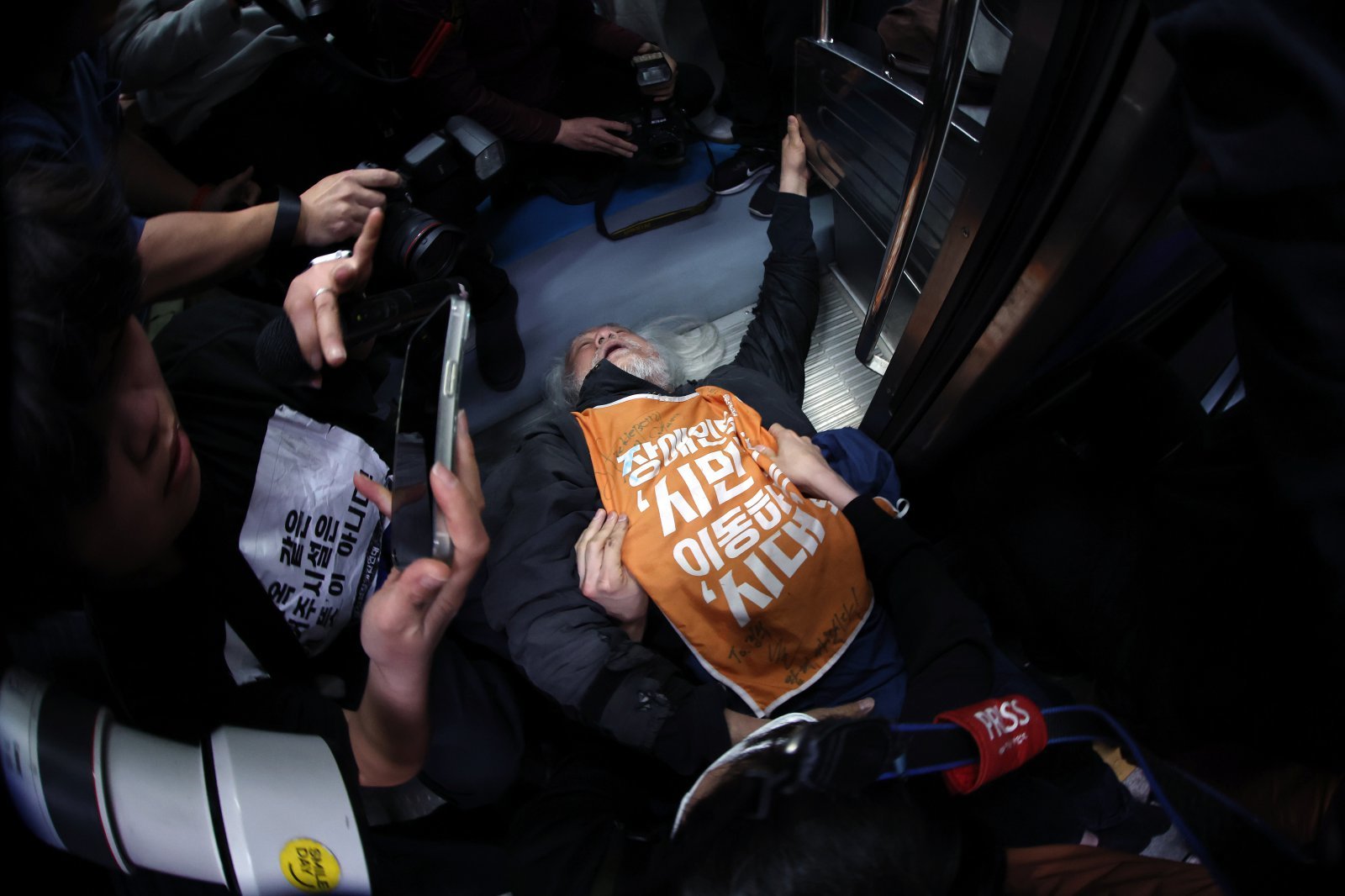 박경석 전국장애인차별철폐연대(전장연) 대표가 21일 서울 지하철 4호선 혜화역 동대문 방면 승강장에서 제62차 ‘출근길 지하철 탑니다’ 시위를 벌이던 중 이를 저지하던 경찰·서울교통공사 직원 등과 충돌하며 열차 입구에 넘어져 있다. 2025.4.21/뉴스1