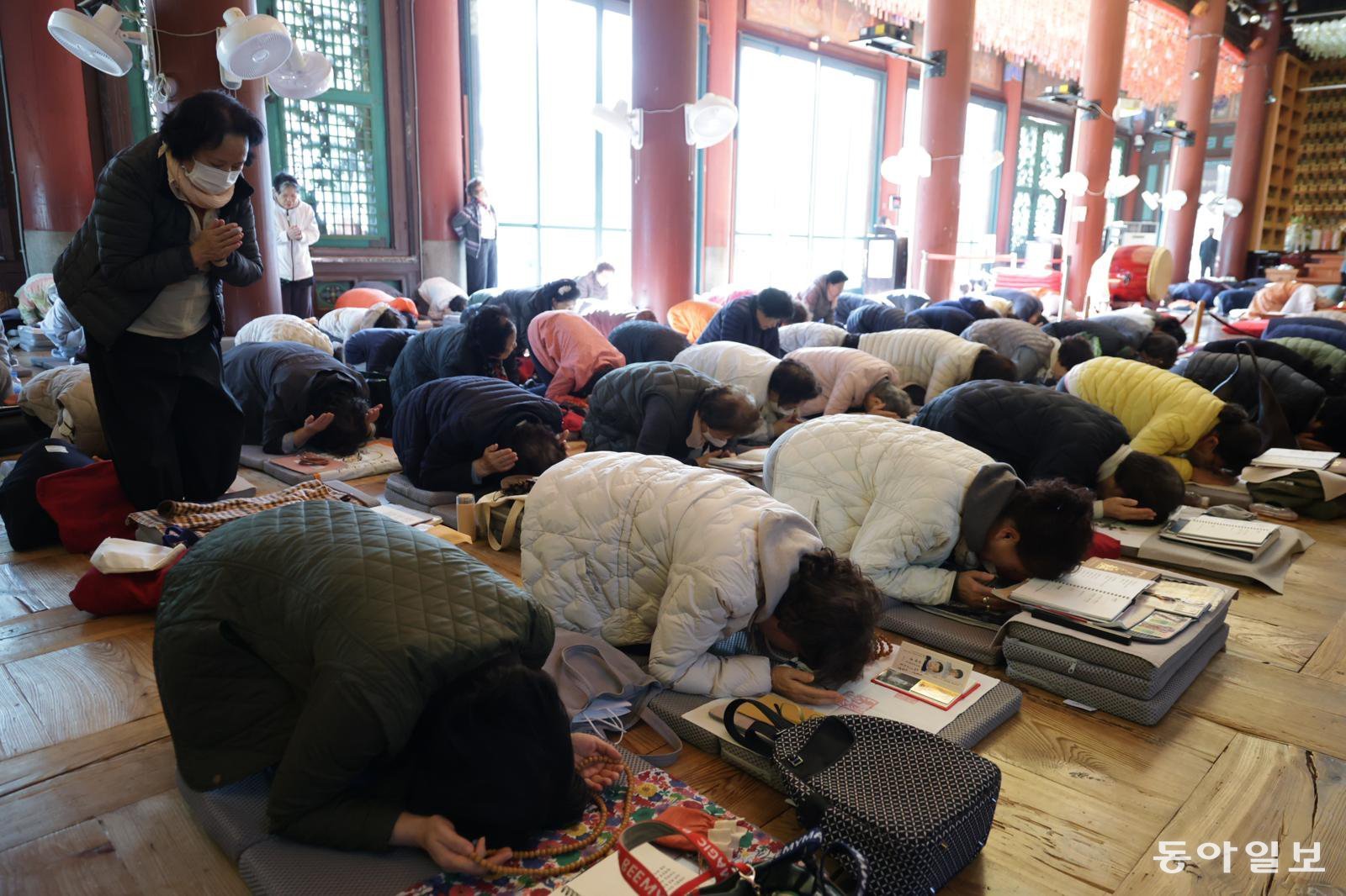 2026학년도 대학수학능력시험을 11일 앞둔 2일 서울 종로구 조계사에서 수험생을 둔 불자들이 자녀들의 고득점을 기원하며 기도하고 있다. 박형기 기자 onehsot@donga.com