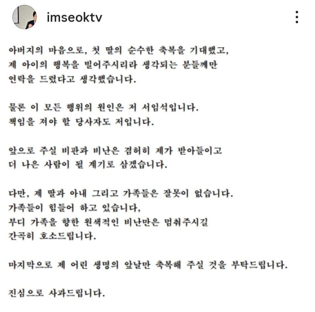 다만 “제 딸과 아내 그리고 가족들은 잘못이 없다. 부디 가족을 향한 원색적인 비난은 멈춰주시길 바란다”며 “마지막으로 제 어린 생명의 앞날만 축복해 주시길 부탁드린다”고 덧붙였다.