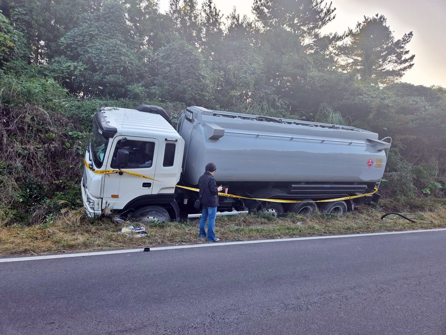 6일 제주소방안전본부에 따르면 지난 5일 오후 7시18분께 서귀포시 상효동 제8산록교 인근 도로에서 탱크로리(용량 2만4000ℓ) 차량이 도랑에 빠졌다.