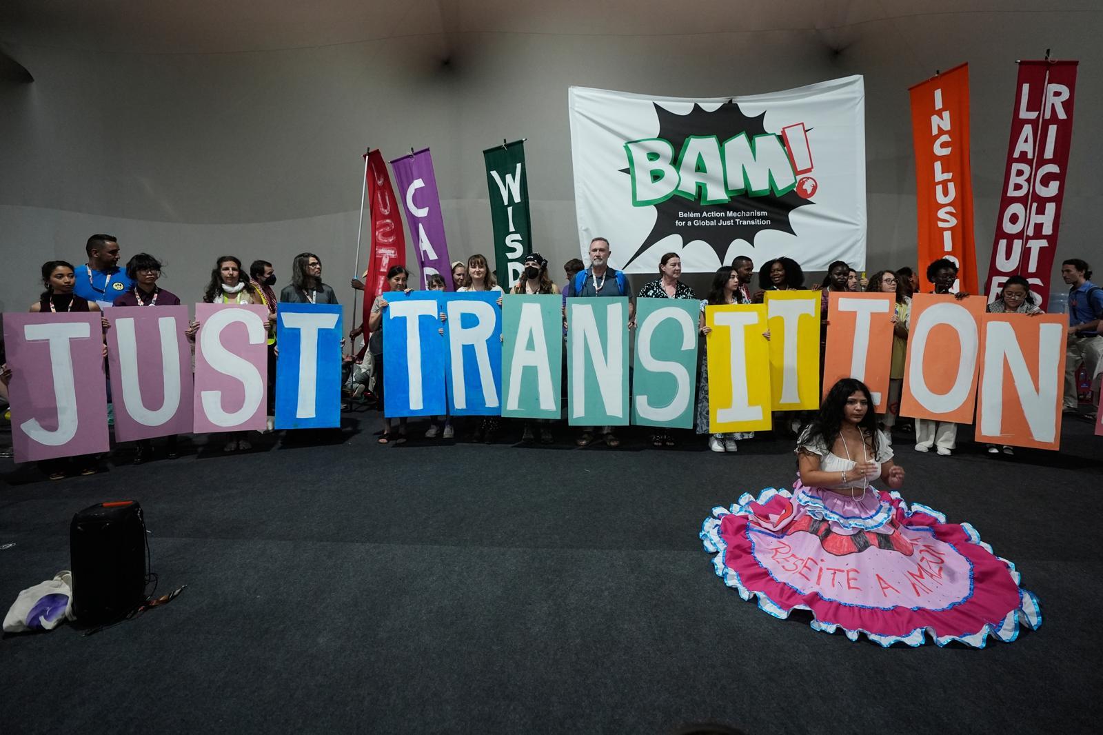 11일(현지 시간) 브라질 벨렝에서 열린 제30차 유엔기후변화협약 당사국 총회(COP30) 행사장에서 환경단체 관계자 등이 화석연료 탈피를 의미하는 ‘정의로운 전환(just transition)’이란 문구가 적힌 팻말을 보이고 있다. 벨렝=AP 뉴시스