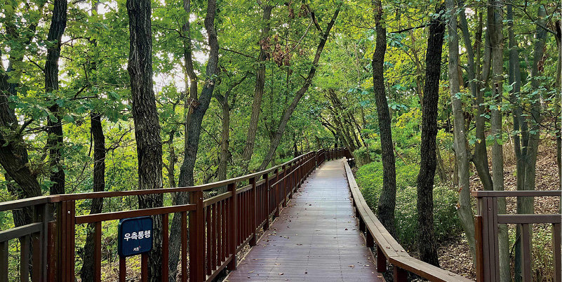 기존에 두 구간은 서로 단절돼 있던 데다 두 구간 사이에 경사가 급한 일반 산책로가 있어 휠체어나 유모차, 보행 약자 등이 이동하기에 불편했다. 이에 구가 경사를 완화하고 이동 동선을 재정비해 약 0.2㎞의 연결로를 새로 만듦으로써 1·2단계 전 구간을 무장애숲길로 조성한 것. 새로 개방된 연결로는 누구나 편하게 통행할 수 있도록 설계됐다.