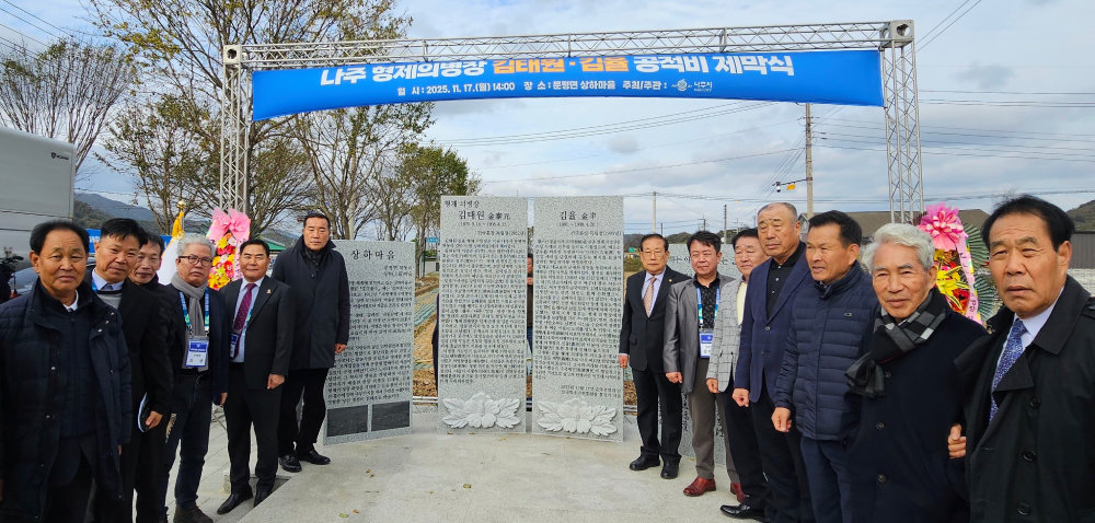 18일 나주시 등에 따르면 전날 오후 2시 문평면 북동리 상하마을에서 나주 출신 형제 의병장 김태원·김율 장군 공적비 제막식을 열었다. 행사에는 윤병태 나주시장과 시민 등 100여 명이 참석했다. 형제 의병장의 구국정신을 기리고 이들의 희생과 헌신을 후세에 전하기 위해 마련된 자리다.