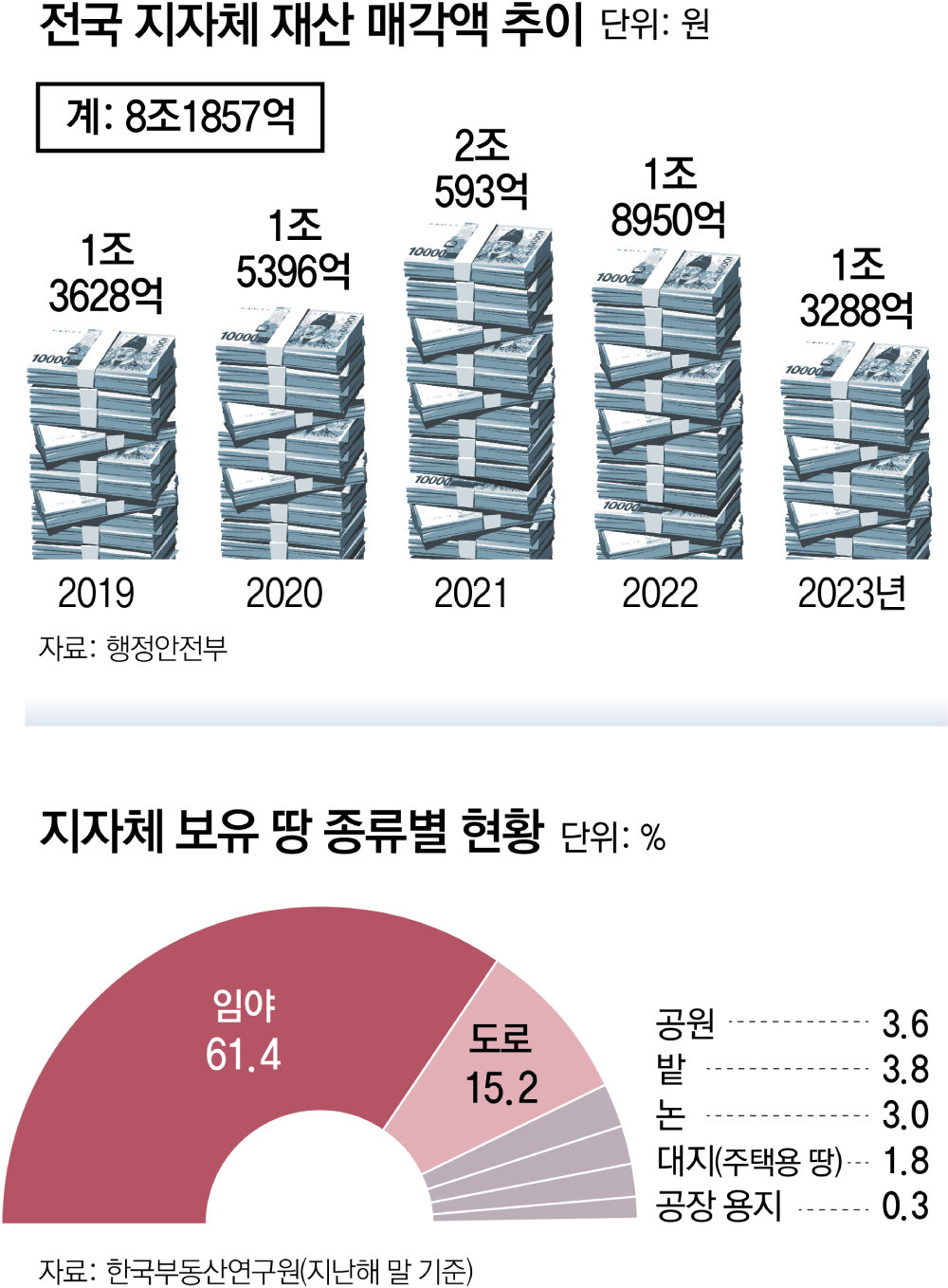 ‘팔 만한 땅’이 그리 많이 남지 않았다는 우려도 커지고 있다. 한국부동산연구원에 따르면 지난해 말 기준 전국 지자체가 가진 땅은 8566km²로, 서울 면적의 14배가 넘지만 이 중 61.4%가 임야였다. 그 뒤를 도로(15.2%)와 밭(3.8%), 공원(3.6%) 등이었다. 공공 목적에 묶여 사실상 개발이나 매각이 어려운 땅이다. 반면 개발이 용이한 대지는 1.8%, 공장용지는 0.3%에 불과했다.